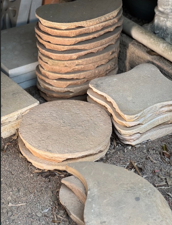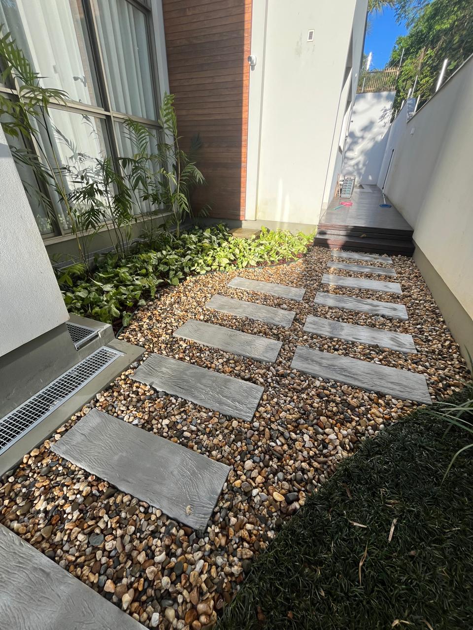 Passeio cimentício madeirado, passeio arenito, passeio drenante e meio fio de jardim.